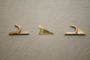 | SleepkabelgatenDan verder met de doorvoeren voor de sleepkabels, een aan beide zijden. Tja ik kan dit niet echt omschrijven. Ik begin met de onderdelen. Om te beginnen met een messing buisje Dit wordt aan de bovenzijde voorzien van een abs ovaaltje alles volgens de maten op de tekeningen die Henk en John gemaakt hebben. Dan komt er een gebogen stukje abs waar de kabel overheen loopt. Deze delen bij elkaar vormen de maat voor een gat in onze mooie reling. Als alles past komt er aan de buitenzijde nog een plaatje abs tegen vanaf de ronding messing buis naar voren en hierop nog een afdekking om alles dicht te maken. De foto verduidelijkt hopenlijk het een en ander.