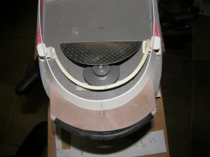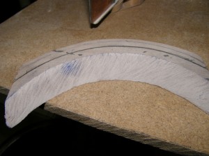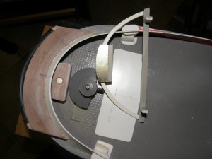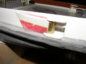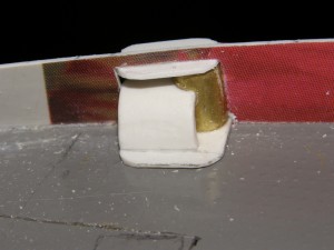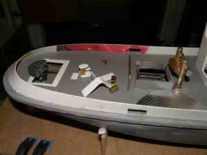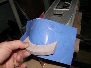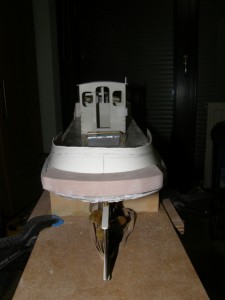 We beginnen met de uitstulping achter boven op het dek. Deze dient om bij het slepen aan de achterzijde voldoende body te hebben zodat de boot geen schade oploopt. Ik heb daarvoor een blok ureool gebruikt. Deze is eerst op de goede dikte gebracht. Daarna heb ik de ronding van de reling met hoek overgenomen op de blok ureool. Grof wordt het eerst uitgevijld en daarna breng ik een vel carbonpapier aan tussen de reling en de bij te werken blok ureool. Als je dan dit blok een beetje beweegt heb je het blauw van het carbonpapier op je blok ureool zitten daar waar het materiaal in aanraking is met de reling. Je kunt dan steeds preciezer je blok bijwerken. Hierna moet aan de onderzijde iets bijgewerkt worden daar het dek een bolling heeft. Ook hiervoor kun je de methode carbonpapier gebruiken. Vervolgens moet de achterzijde van het blok afgerond worden. En dan komt er nog een rubber strip tegen. Ik had alleen een ronde rubber (van een vrachtwagen elastiek voor dekzeilen)Β ter beschikking. Daar rubber zich zeer moeilijk laat snijden heb ik de rubber gelaten voor wat het was. De ureool blok heb ik met een ronde frees voorzien van een halfronde sleuf waar de rubber perfect in pas. Als alles past dan kan de blok zonder rubber gemonteerd worden. Hiervoor heb ik vijf minuten epoxy gebruikt. Deze vult de laatste oneffenheden goed op en lijmt ook erg goed. De rubber komt na het verven pas op zijn plaats.