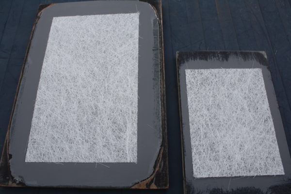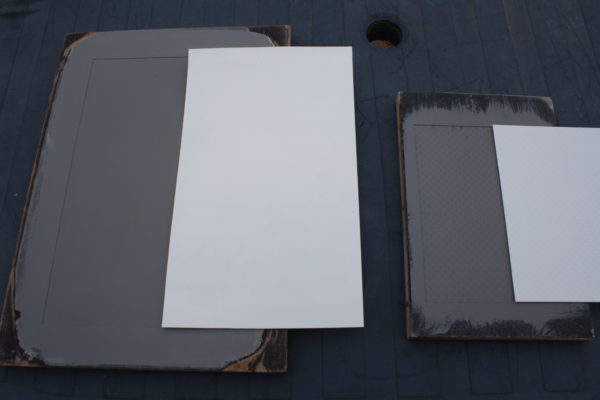 Het dek heeft een tranenplaat profiel. Om het gehele dek te voorzien van tranenplaat, dienen er drie tranenplaten van abs plaatmateriaal gekocht te worden om het oppervlak te bedekken en nog een plaat met een ander profiel voor de klep. Dat wordt een dure liefhebberij. De kosten bedragen circa Euro 10/stuk. Omdat er vier leden zijn die de Kobus gaan bouwen, was de keuze snel gemaakt om deze zelf te gaan vermenigvuldigen. Dat betekent van een abs plaat een negatief maken en dan het aantal benodigde afdrukken vervaardigen. Deze werkzaamheden werden door collega clublid Henk Muijsers ter hand genomen. De plaat werd op een stevige vlakke onderplaat gelegd en ingestreken met lossingsmiddel. Daarna werd een laag gelcoat en vervolgens een laag glasvezelmat aangebracht. Daarop weer een vlakke plaat die d.m.v. over het gehele oppervlak aangebrachte lijmtangen, gelijkmatig werd aangedrukt. Na de droogtijd werd het geheel omgedraaid en de abc plaat verwijderd (foto links boven). Het verkregen negatief is vervolgens van lossingsmiddel voorzien. Na droging kan een laag gelcoat (foto midden boven) en een laag glasvezelmat worden aangebracht. (foto rechts boven). Op deze massa werd een vlakke plaat voorzien van lossingsmiddel aangebracht en ook weer d.m.v. lijmtangen vlak aangedrukt (foto links onder). Na droging de vlakke plaat verwijderd en het positief uit de mal verwijderd (foto’s links onder midden en rechts). Dit proces kan naar believen een aantal keren herhaald worden.