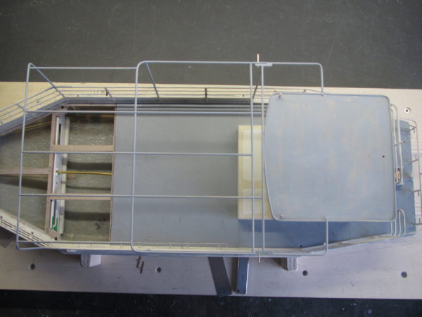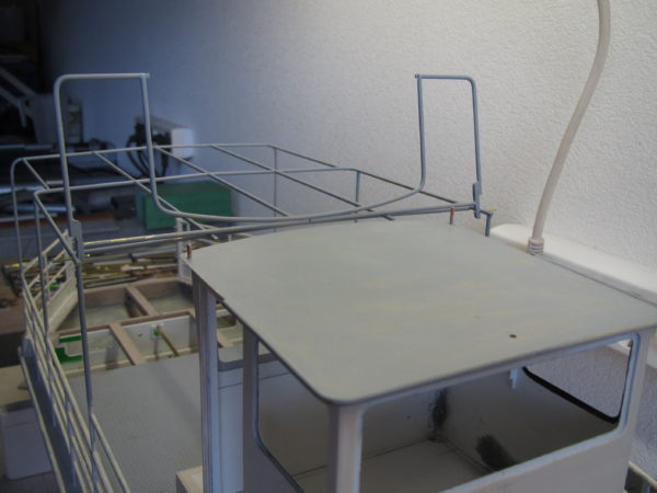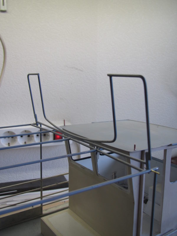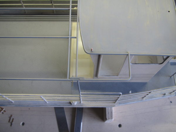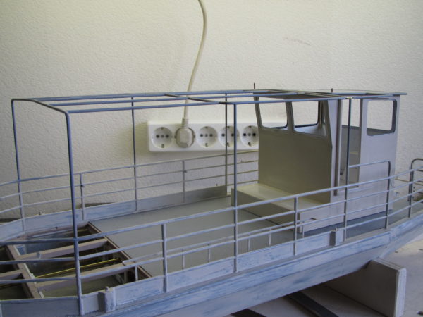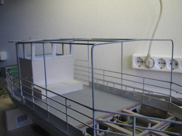 Om de bemanning tijdens hun werkzaamheden en de passagiers tijdens de overtocht niet bloot te stellen aan de weersomstandigheden, is het pont voorzien van een overkapping. Dit is een overkapping die staat op zes palen en rust tevens op het dak van de kajuit. De bovenzijde van de overkapping is voorzien van een buizenstelsel en afgedekt met zeil. In de dagelijkse praktijk geeft dat geen problemen. Moet men al een keer in de machinekamer zijn, dan kan dit door de deur aan de achterzijde van de kajuit. Maar bij het model moet, wil je ergens bijkomen, de kajuit verwijderd kunnen worden. Maar dat gaat zo maar niet, omdat aan de bovenzijde van de kajuit het zeil zit. Om toch overal bij te kunnen, heb ik een gedeelte van het zeil inclusief een stuk van de overkapping draaibaar gemaakt. De bedoeling is dat eerst het zeil wordt weggedraaid. Daarna kan de kajuit verwijderd worden.