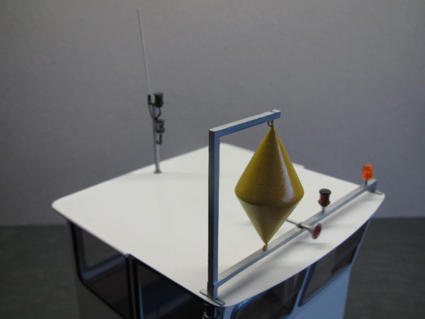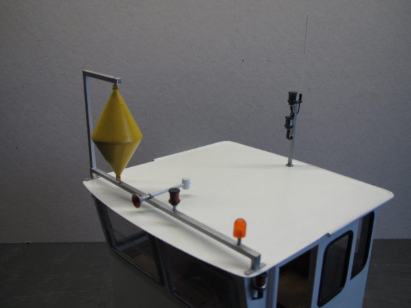 Boven op het dak zijn nog diverse zaken aangebracht. Aan de voorzijde van het dak is een beugel aangebracht met daarop de oranje zwaailamp, daarnaast de rode rondom schijnende lamp, de signaalhoorn en helemaal rechts de gele ruit. In het midden aan de achterzijde is in de top een antenne aangebracht en daaronder twee verlichtingsarmaturen met bovenin de witte toplamp, onderdeel van de vaarverlichting en daaronder de groene rondom schijnende lamp.