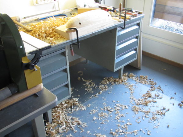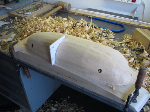 Met behulp van een blokschaaf, houtbeitel en mallen de romp vormgegeven. De eerste 10 mm vanaf het dek blijven recht. Hier komt later een rubberen stootrand in. Omdat de spantlijnen op het model moet staan in verband met het aanbrengen van diverse onderdelen, was een krasblok nodig. Maar die was niet voorhanden. Daarom maar een simpel iets gemaakt van voorhanden materiaal. Dat werkte prima.