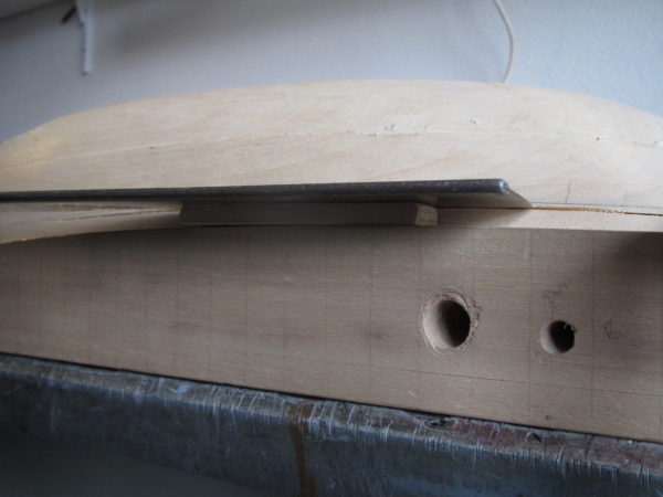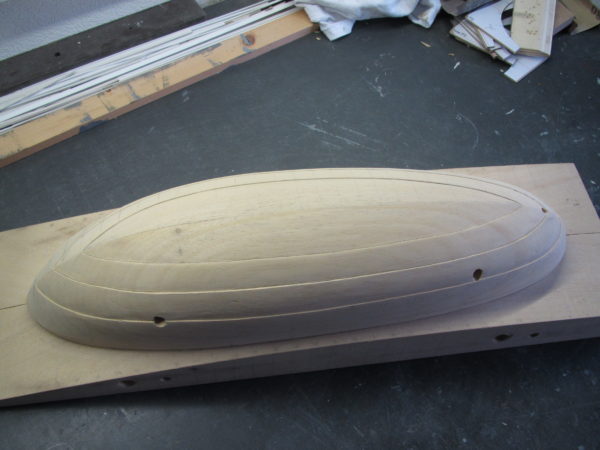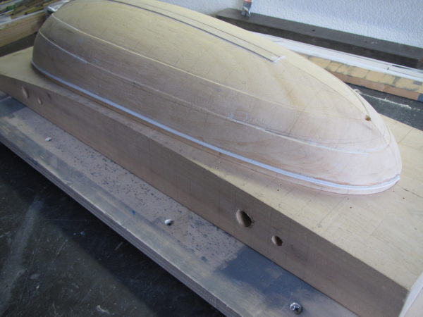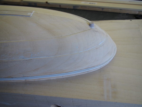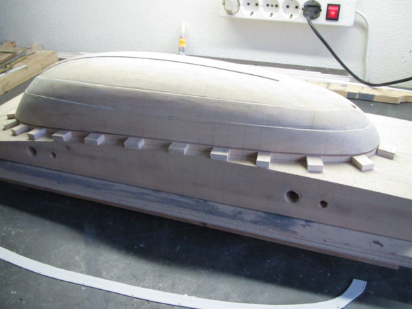 Vervolgens dient het model aangepast te worden zodanig dat de platen zichtbaar worden. Hiervoor is het nodig dat de lijnen op de houten romp worden weergegeven en daarna middels een houtbeitel handmatig vorm worden gegeven. Daarna de rand aan de buitenzijde aangebracht. Eerst een gleuf rondom aangebracht met een kapzaag en daarna uit 1 mm dik kunststof plaat de rand , inclusief het in te laten gedeelte uitgesneden. Na rondom afstandsblokjes te hebben aangebracht, kon de kunststof strip geplaatst worden en met secondelijm vastgezet worden.