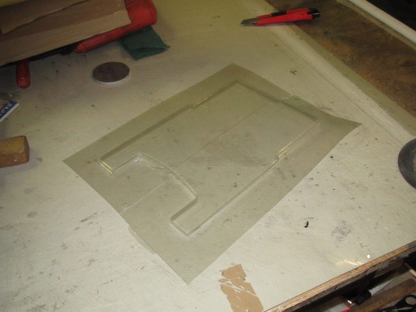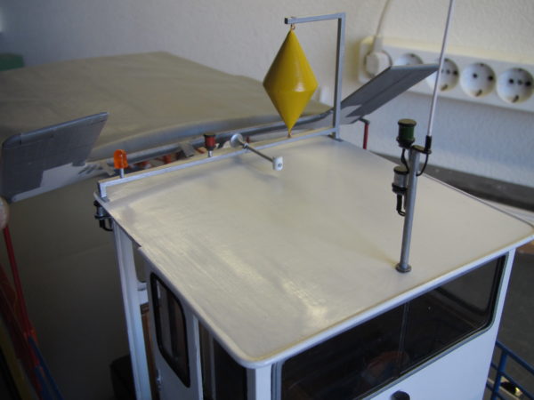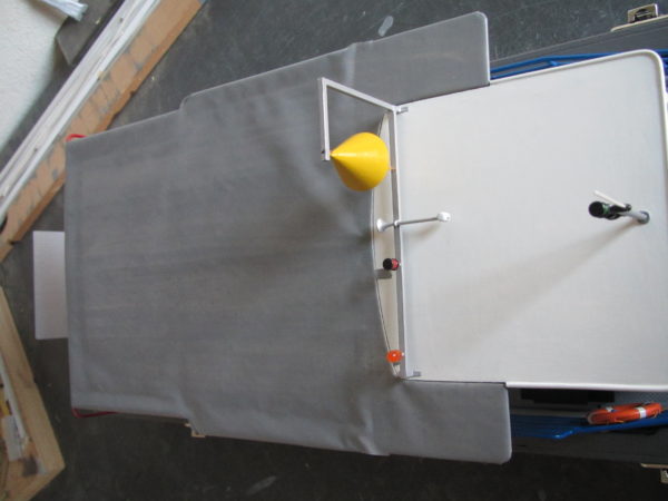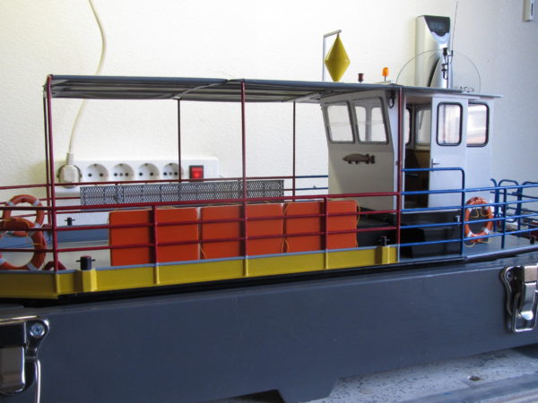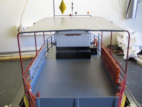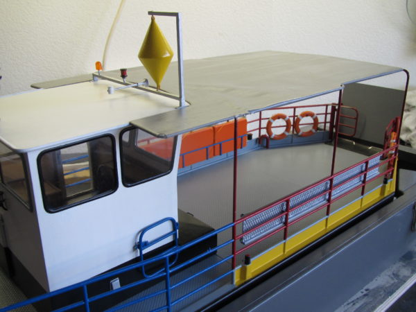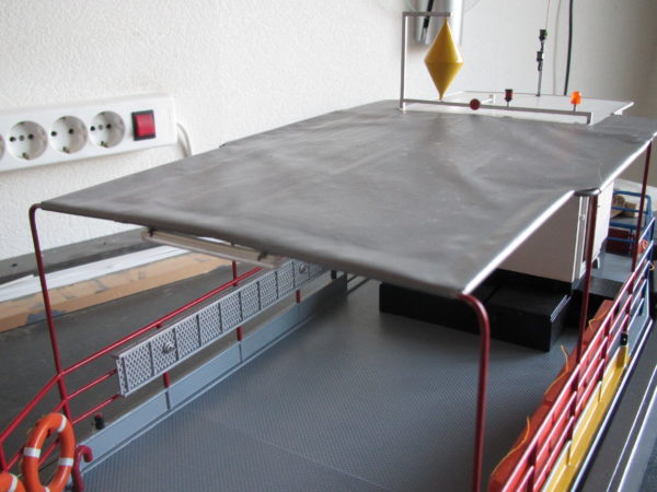Dat viel nog niet mee. Nadat de bouw van het pont af was dacht ik dit even in een verloren uurtje op te lossen. Maar niets was minder waar. Ik had in gedachte hier stof voor te nemen, maar deze was te dik, niet genoeg buigbaar, niet de juiste kleur etc. En met naald en draad omgaan is niet mijn sterkste punt. Toen kwam het idee om de bovenzijde te voorzien van een diepgetrokken kap van plastic folie. Daarvoor moest eerst een mal gemaakt worden. Nadat deze gereed was ben ik naar een firma in de buurt gegaan die dat voor me wilde doen. Dat lukte wonderwel. Maar omdat de kajuit er ook af moet kunnen in verband met het plaatsen van de accu, leverde dat toch problemen op. Of het zat te strak of te los maar goed passend maken was vrijwel niet mogelijk. Daarom terug gekeerd naar de eerste gedachte en vliegerdoek gekocht. Maar dit had niet de juiste kleur. Na het doek op een vlakke ondergrond te hebben bevestigd, heb ik met een prop papier, gedrenkt in verf, het zeil een kleur gegeven. Met een borstel of roller aanbrengen gaf het probleem dat de lak er te dik op kwam te zitten en daardoor losliet. Vervolgens met dubbelzijdige plakband het zeil bevestigd. Doordat de achterzijde van het afdak draaibaar is gemaakt, kan de kajuit verwijderd en de accu geplaatst worden.