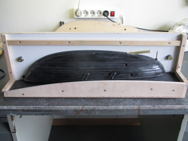 Nadat de romp gereed was, begonnen met de voorbereidingen voor aanmaak van het negatief. Omdat het een tweedelig negatief gaat worden, komt er in het midden een schot te staan. Hier tegenaan wordt het opvulstuk en een helft van de romp vastgeschroefd. Omdat naderhand het inbrengen van de roerkoning en de schroefas veel pas en meetwerk met zich meebrengt, er voor gekozen om dit in het model voor het negatief aan te brengen. Ter plaatse van de roerkoning en de schroefas worden buizen in het schot geplaatst.