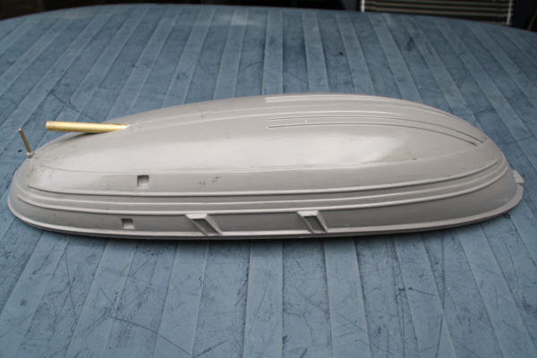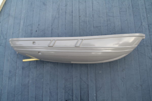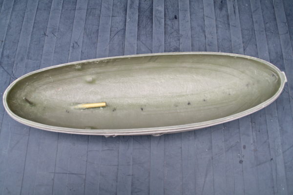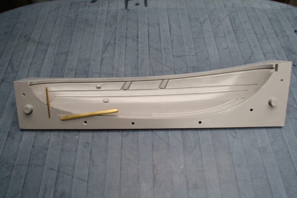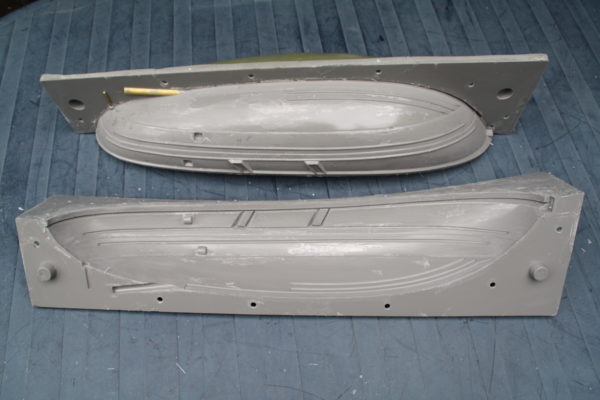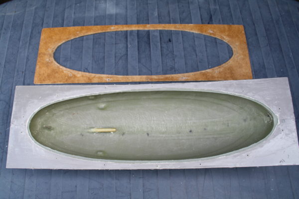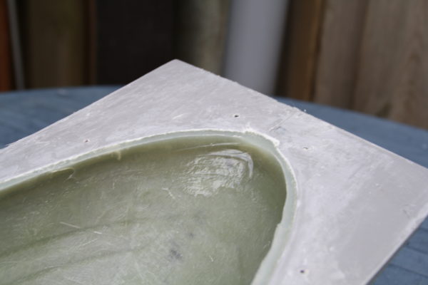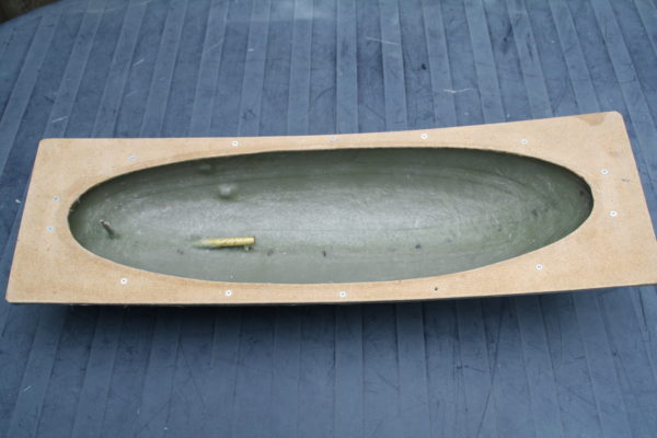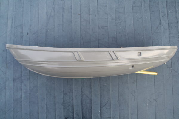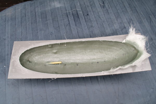 Nadat het negatief was gecontroleerd op oneffenheden, begonnen met het negatief te voorzien van vier lagen lossingsmiddel. Tussen iedere laag goed oppoetsen en als laatste een laag PVA (Polyvinylalcohol) aangebracht. Dit vormt een zeer goede film tussen het lossingsmiddel en de Gelcoat. Het wordt niet aangetast door olie en/of vet, is reukloos en niet giftig. Hierna worden de buisjes voor de roerkoning en de aandrijfas geplaatst. Vervolgens zijn de beide helften tegen elkaar geschroefd. Als eerste wordt in twee lagen de Gelcoat aangebracht. Om bij het aanbrengen van de glasvezelmat geen problemen te krijgen, worden alle verdiepingen opgevuld met een vulmiddel (LP Plast). Daarna zijn de glasvezelmatten aangebracht (twee lagen). Ter plaatse van de voor- en achterzijde is nog een extra laag aangebracht. Als de hars begint uit te harden, wordt aan de bovenzijde de overtollige resten met een mesje verwijderd en kan de hardboard plaat worden aangebracht middels schroefjes. De ruimte tussen de onderzijde van de hardboard en de binnenzijde van de romp wordt opgevuld met LP Plast. Dit vormt later een rand rondom de binnenzijde van de romp waar het dek op verlijmd kan worden. Na een uithard tijd van circa 6 uur kon de romp uit het negatief worden verwijderd. Dat verliep zonder problemen. De romp weegt circa 300 gram.