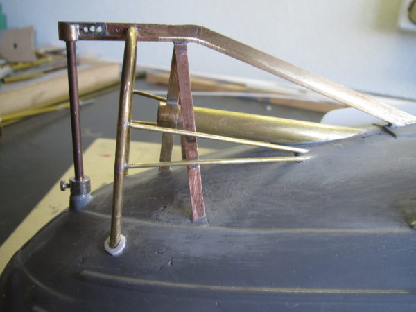 De romp van de Makerboot is al voorzien van allerhande zaken die je niet snel terug vindt bij een andere boot. Zeker het gedeelte rond de schroef en het roer. Hier is niets recht. Alles staat onder een hoek. Ook het roer is niet glad en strak. Wil je het maken zoals het hoort, dan kun je de lol op. Een uitdaging dus. Stangen, beugels en steunen zijn gemaakt van messing en koper. Het roer is van ureool (kunststofblok materiaal). De boven en onderzijde van het roer zijn van dun ijzer plaatmateriaal.