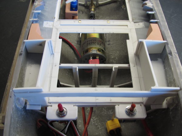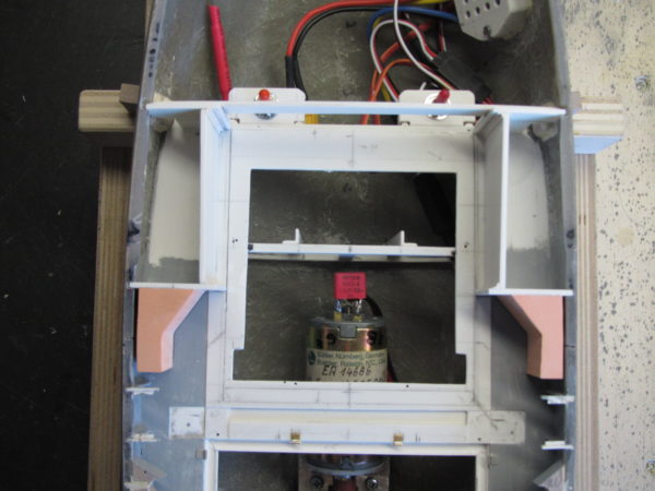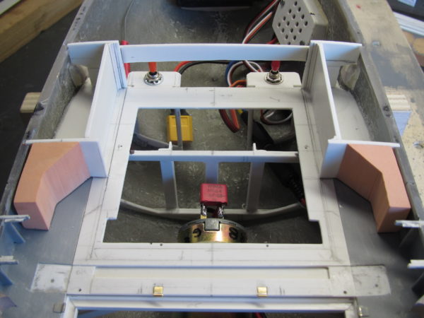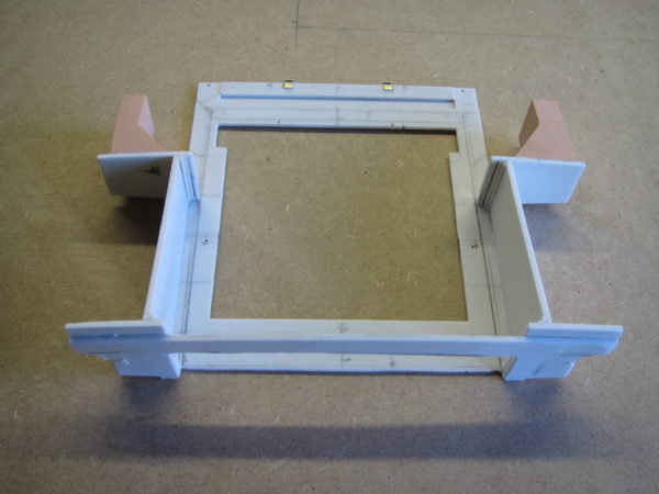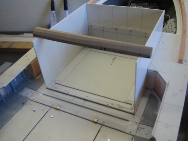 De kajuit staat op de kuipvloer. Als ik de kajuit gelijk vastmaak aan de kuipvloer, dan kun je veel moeilijker bij een aantal onderdelen komen tijdens de bouw. Vandaar er voor gekozen een raamwerk te maken waar in een later stadium de kajuit op gemonteerd kan worden. Tevens de voorzieningen aangebracht waar later de traptreden van dek naar kuipvloer komen.