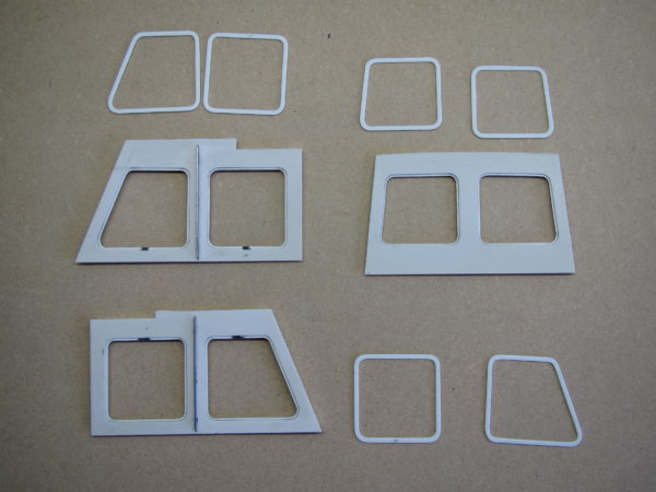 Begonnen met de drie zijkanten te maken en daar de uitsparingen voor de ramen in aan te brengen. Vervolgens aan de binnenzijde en stuk polyesterplaat van 0.5 mm dik gelijmd ter plaatse van de raamuitsparing. Dit is aan de buitenzijde rondom 1 mm groter dan de raamopening. Vervolgens met de figuurzaag de binnenzijde verwijderd, die 1 mm kleiner is dan de raamopening. Hiermee krijg je een sponning waar later de raam in kan worden aangebracht. Aan de buitenzijde is hetzelfde gedaan, maar dan niet verlijmd. Hiermee krijg je een dun raamwerk. Na afwerken en lakken wordt eerst de raam in de sponning geplaatst en vastgezet door er het raampje in vast te lijmen. Heb dit gedaan om de rubber in de raam te kunnen nabootsen.