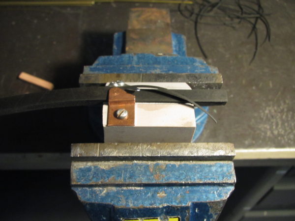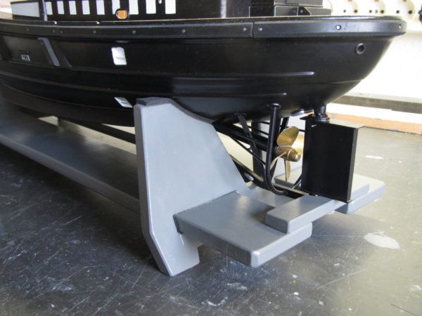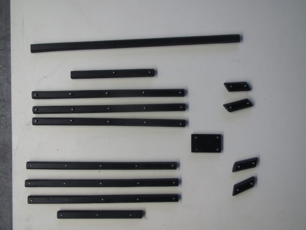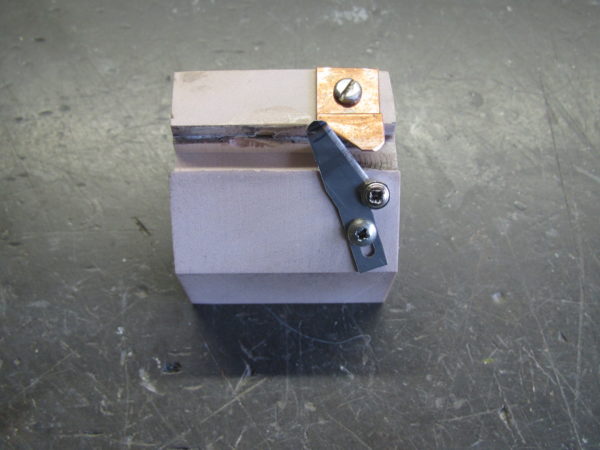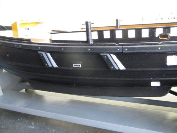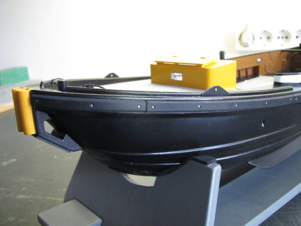 Aan de zijkanten van de romp zijn Fenders aangebracht. Verder zit er nog een aan de onderkant voorzijde. De Fenders zijn gemaakt uit een rubberen mat van 5 mm dik. Van deze mat zijn strips van 8 mm breed gesneden, waarna ze middels schuren lang de schuurschijf op de juiste breedte zijn gemaakt. De Fenders zijn aan de boven en onderzijde voorzien van een schuine kant. Als je dit met een schuurschijf moet doen, wordt het niet gelijkmatig. Collega Henk Muijsers kwam op een gegeven moment met een hulpstuk aan dat hijzelf in elkaar had gezet. Je hoeft de Fender er maar doorheen te halen was zijn opmerking. Ben ermee aan de slag gegaan, maar het lukte niet erg. Ze werden niet mooi strak. Na wat experimenteren bleken twee zaken van invloed te zijn. De uitsparing waar de rubber doorheen gaat, moet dezelfde breedte hebben als het rubber. Dan speelt nog of je het rubber er doorheen duwt of trekt. Een van beiden gaat prima maar niet beide zaken afwisselen. Dan krijg je geen strakke afschuining. Als laatste zijn de gaten geboord voor de boutjes.