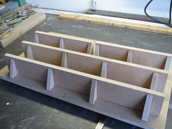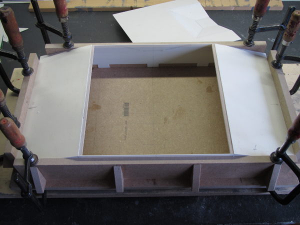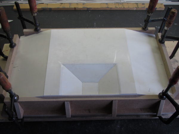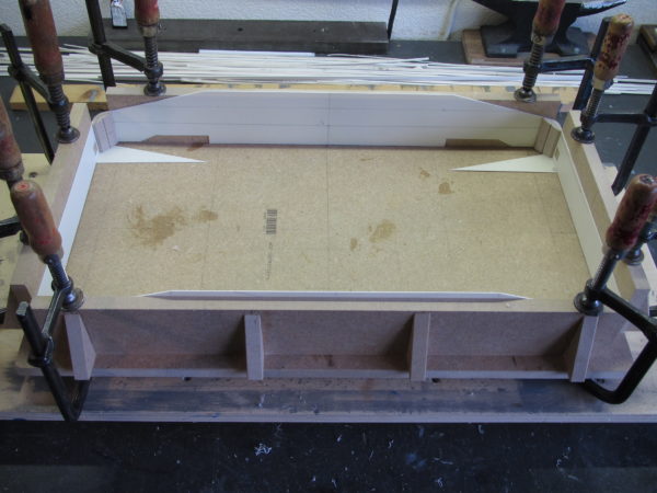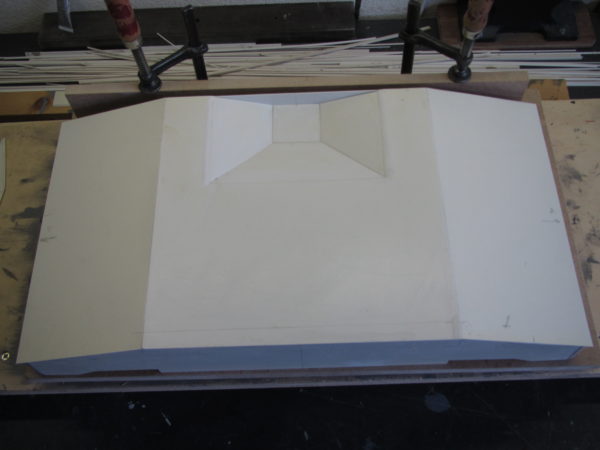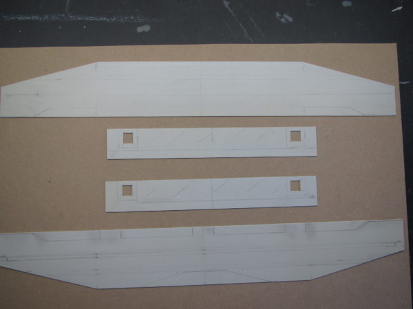 Gelet op het gewicht, besloten om de romp van 1 mm dik ABS materiaal te maken. Maar omdat dit niet erg stabiel is, eerst vier wanden gemaakt van MDF en verstevigd met ribben. Het laatste gedaan om ze goed en stabiel haaks te kunnen vastzetten op een plaat met kleine lijmtangen. Vervolgens de vier buitenzijden aangemaakt en de vier hoeken. Deze zijn uitgevoerd in kunststof blokmateriaal. Eerst de vier hoeken aan de uiteinde van de lange zijde verlijmd. Daarna de MDF wanden op de juiste maat gezet, de vier buitenwanden van de romp tegen de MDF wanden geplaatst en alles verlijmd. Vervolgens in de bodemplaat de uitsparing gemaakt voor de plaats waar de schroeven geplaatst worden. Toen dit gereed was de de gehele bodem aangebracht. De buitenzijde kon nu afgewerkt worden.