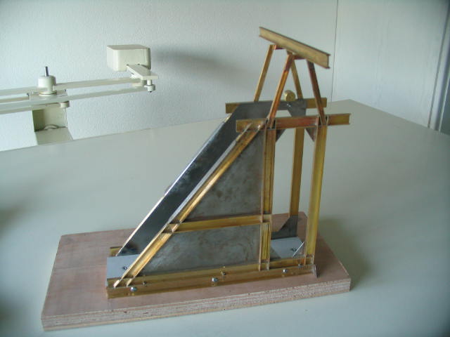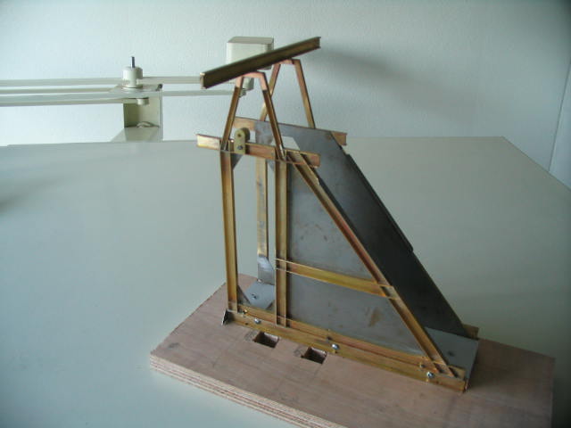 Ook dit onderdeel moet stevig zijn en stabiel uitgevoerd worden. Omdat hier veel Din balken in het origineel zijn toegepast, was het niet zo moeilijk hier geschikte messing profielen op schaal voor te krijgen. Bij eerdere bezoeken in Sliedrecht waren er al diverse zaken opgemeten en op foto gezet. Ook hier weer eerst begonnen met een tekening op schaal te maken om te zien hoe e.e.a. uitkwam. N.a.v. deze tekening konden ook de afmetingen van de benodigde tandwiel worden bepaald. Deze tandwielen zijn nodig voor de aandrijving van de emmerladder.  Omdat deze tandwielen goed de krachten moeten kunnen weerstaan, heb ik gekozen voor messing tandwielen. Via internet waren ze snel gevonden en gekocht. Omdat het frame uit messing profielen wordt opgebouwd, diende het naderhand aan elkaar gesoldeerd te worden. Hiervoor twee mallen gemaakt (een linkse en een rechtse uitvoering) met een tweeledig doel. Het eerste doel was mallen te hebben om de profielen goed op maat te kunnen maken en ten tweede konden later de mallen dienst doen als soldeermal.  Ook dit keer verliep het soldeerproces zonder problemen. Nadat de twee zijden gereed waren heb ik een opstelling gemaakt zoals ze later ook op de baggermolen komen te staan. Hierdoor is het mogelijk om de motor en de aandrijftandwielen te monteren en uit te proberen of e.e.a. naar behoren werkt. Daarvoor heb ik nog tandriemen nodig. Dus eerst op zoek naar dit onmisbaar onderdeel.Â