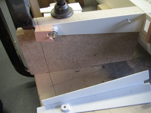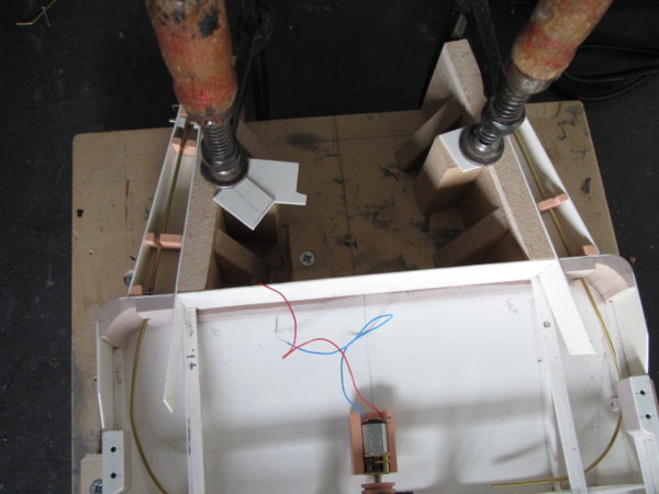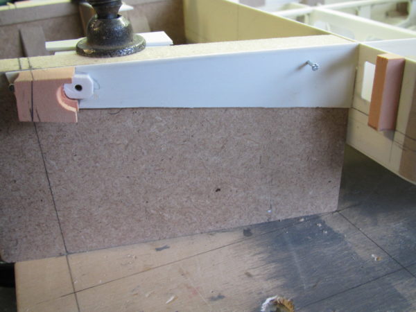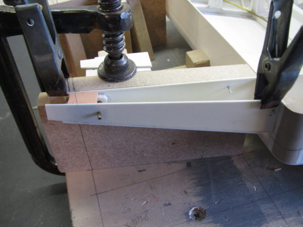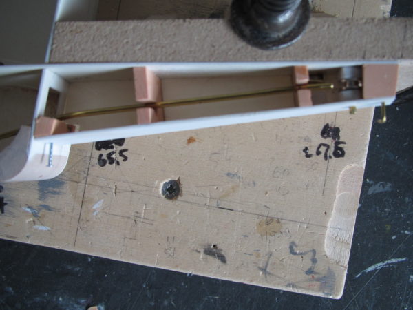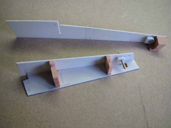 Begonnen met het maken van de uithouders. Om ze alle vier in de juiste stand en op hoogte te brengen, heb ik een plank genomen waar de romp op bevestigd kan worden en gepositioneerd. Op de plaats waar de uithouders komen, zijn ruggen geplaatst. De bovenzijde van de ruggen is de hoogte van de uithouders en tevens de hoek tot de romp. Daarna de vier uithouders aangemaakt, zonder de bovenkant. Deze blijft voorlopig open omdat vanuit de bovenzijde de draad die aan de klep wordt bevestigd en door een messing buisje loopt, aangebracht moet kunnen worden. In een later stadium komt ook nog het mechanisme in de uithouders om de slagbomen te kunnen bedienen. Dat betekent dat het aanbrengen van messing buisjes, mechanisme voor de hefbomen etc., allemaal in een keer gemonteerd moeten worden. Daarna kan pas de bovenzijde worden aangebracht.