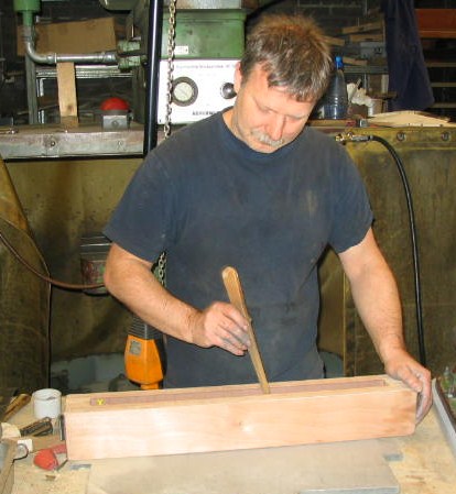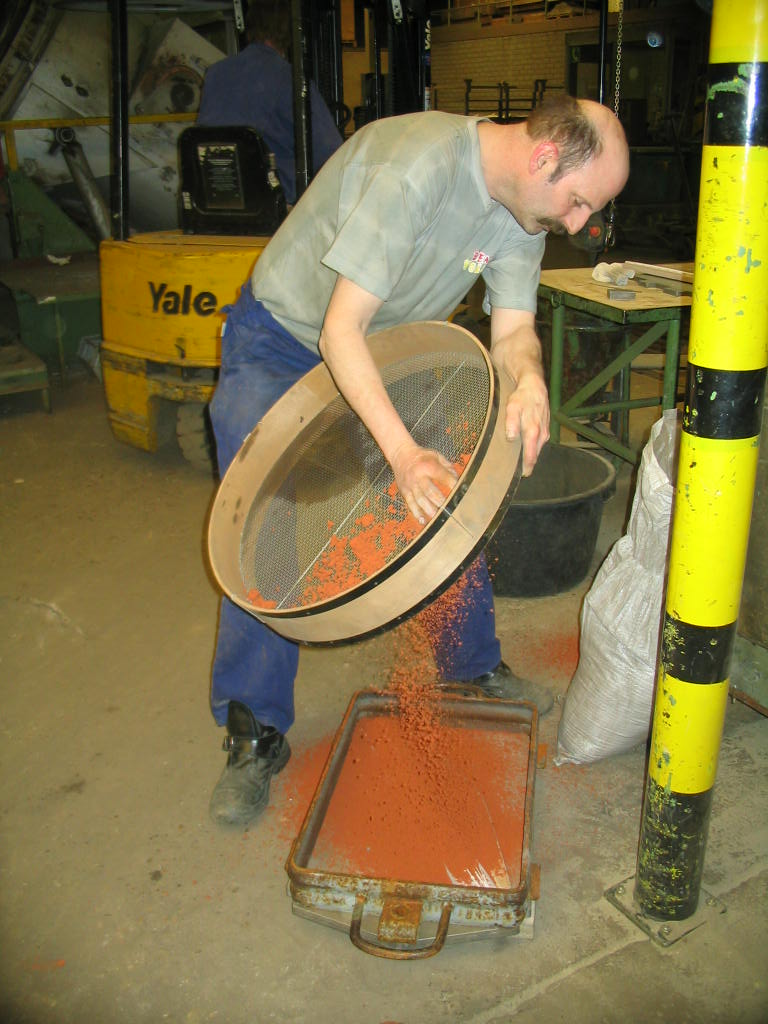 Vandaag de kernbak meegenomen naar het werk om er een kern van te maken. Een kern bestaat uit een mengsel van zand en bindmiddelen. Het gebruikte zand (genaamd coldbox zand), bestaat uit een mengsel van zilverzand, hars en een activator. Dit wordt gemengd tot een homogeen mengsel. Vervolgens wordt met dit zand de kernbak gevuld. In dit geval handmatig vullen en aanstampen. Daarna wordt het geheel begast. Dit gas brengt een reactie teweeg tussen hars en activator. Hierdoor verglaasd het geheel en wordt hard. Na het uitharden kan de kern uit de kernbak worden genomen en het proces kan, indien gewenst, weer herhaald worden. Vervolgens wordt de kern van deelnaad bramen ontdaan. Om het gietoppervlak, daar waar de kern in aanraking komt met vloeibaar aluminium, te verbeteren wordt de kern gedompeld in een coating. Na droging is de kern gereed voor gebruik.Â