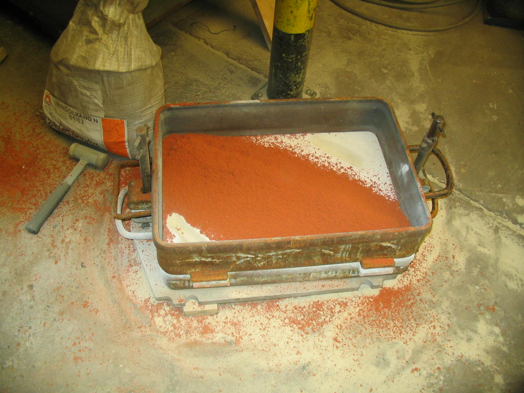 Bovenste rij; de vormkast, het aanbrengen van modelzand, kast gereed voor aanbrengen vormzand en zicht op boven en onderkast na verwijderen van het model.