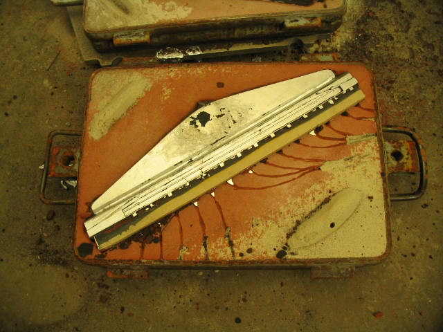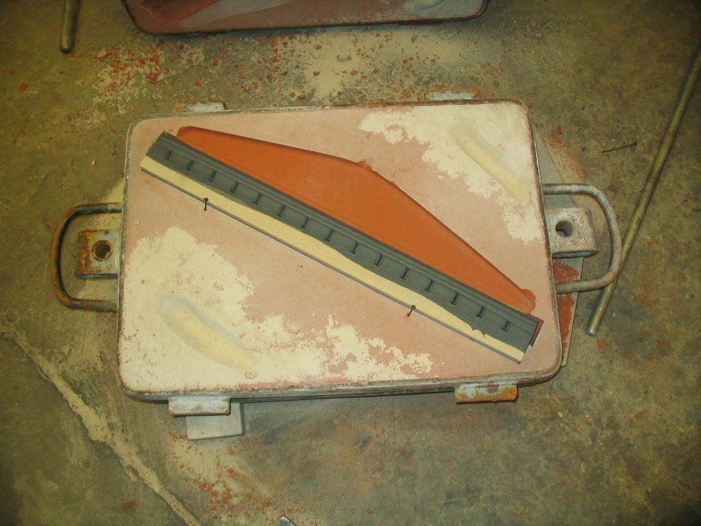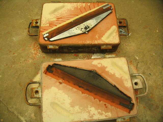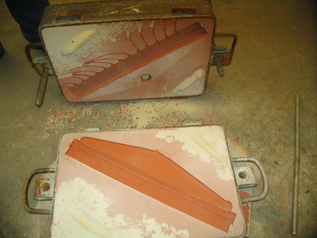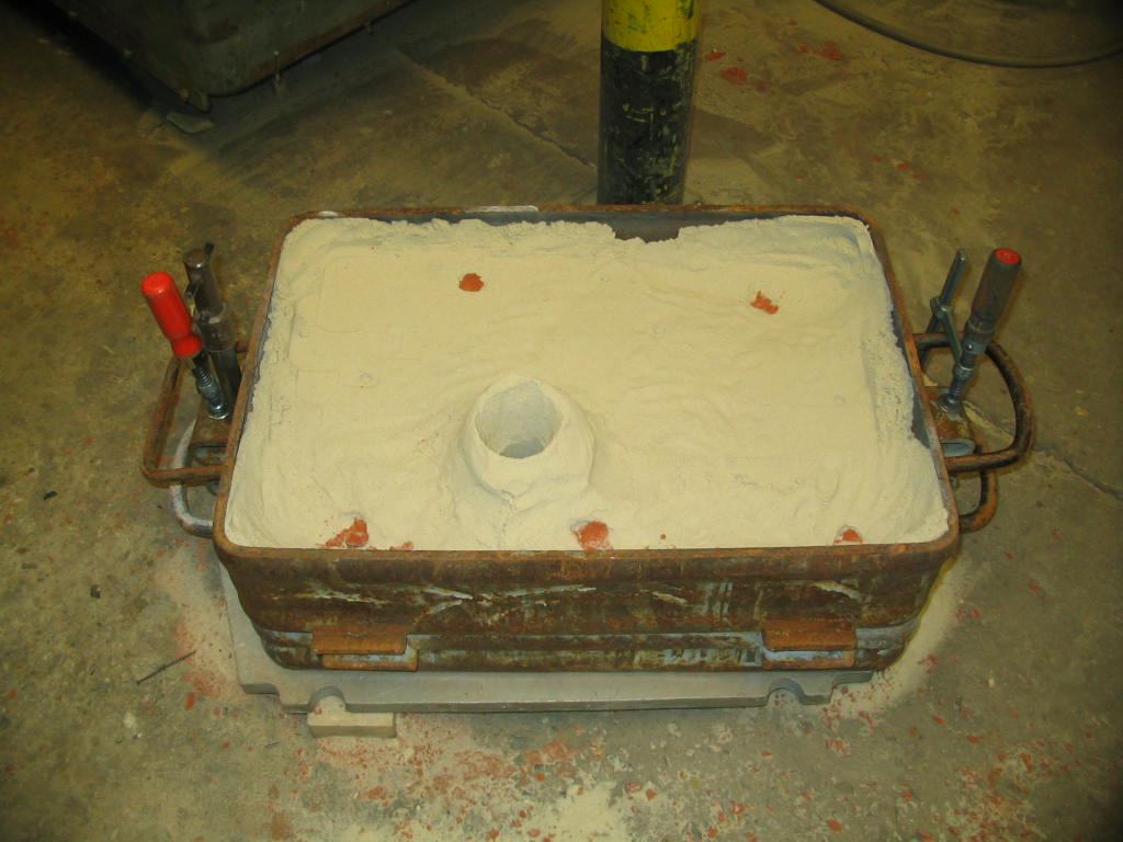 Middelste rij;Â Â onderkast met kern, vorm is gereed om te gieten, het gieten van de vorm, de onder en bovenkast opengelegd na het stollen.