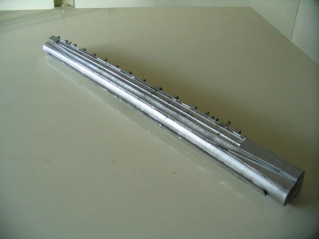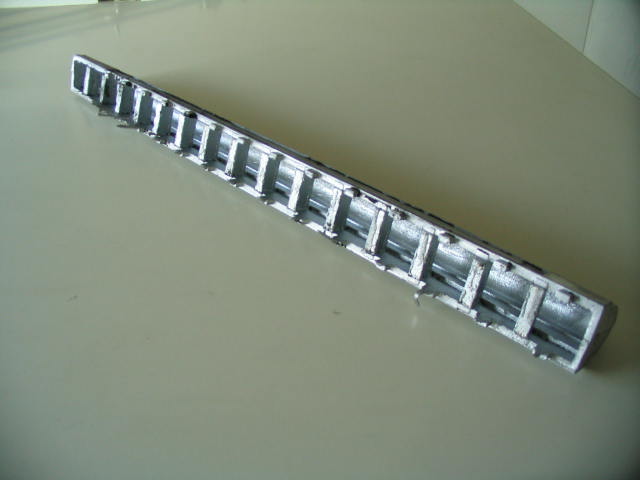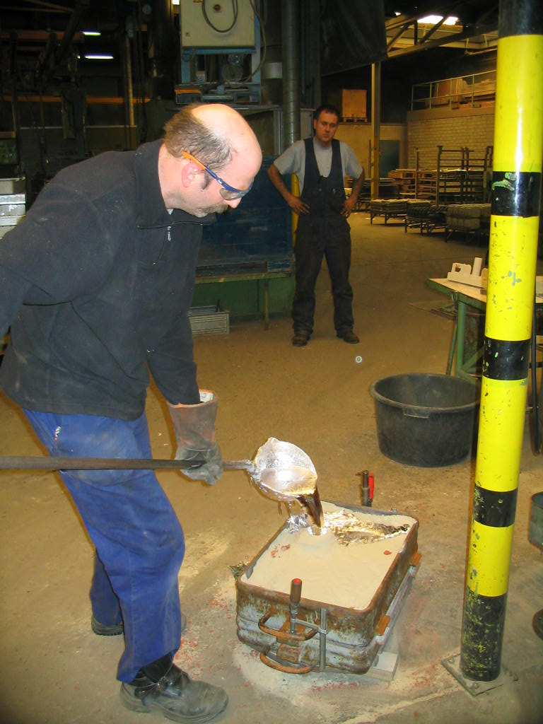 Na het maken van de kern kon gestart worden met het maken van de emmerladder uit aluminium. Dit proces bestaat uit het maken van de vorm, het gieten, uitbreken en het verwijderen van het gietsysteem. Het model is uit twee delen opgebouwd, waardoor het zich gemakkelijk laat vormen. Om te beginnen wordt een helft van het model op een vlakke ondergrond gelegd en er wordt een vormkast omheen gezet. Vervolgens wordt er een laag modelzand aangebracht op het oppervlak van het model, waarna de gehele kast gevuld wordt met vormzand. Het geheel wordt vervolgens verdicht d.m.v. aandrukken en stampen. De onderkast is dan gereed. Na het draaien van de onderkast wordt er een vormkast geplaatst (de bovenkast) op de onderkast. De twee helften worden d.m.v. geleidingspennen gecentreerd. Vervolgens herhalen zich de handelingen die ook bij de onderkast hebben plaatsgevonden. Zodra de twee helften klaar zijn, worden ze van elkaar gehaald en kan het model uit de onderkast en bovenkast verwijderd worden. In de uitsparing die dan ontstaat, kan in de onderkast de kern worden gelegd. In de bovenkast wordt de trechteropening aangebracht waardoor later het vloeibare aluminium naar binnen wordt gegoten. Na dit gedaan te hebben, worden de beide helften weer op elkaar gezet. Om te voorkomen dat tijdens het gieten het aluminium tussen de onderkast en bovenkast door kan ontsnappen, worden de vormkasthelften d.m.v. lijmtangen aan elkaar geklemd. De vorm is nu gietgereed. Als aluminiumsoort is gekozen voor AlSi7Mg legering. Dit is een legering met een goede corrosiebestendigheid. Er werd een giettemperatuur van 780 Graden celsius aangehouden i.v.m. de wanddikte van drie millimeter. Het gieten gaf geen problemen, dus afwachten tot het geheel gestold was en kon worden uitgebroken. Ca. anderhalf uur later was het zover. Het bleek allemaal in een keer goed te zijn gegaan. Het gietstuk was helemaal vol en vertoonde geen gietgebreken. Na het vormzand verwijderd te hebben aan de buitenkant en het kernzand uit de binnenzijde, kon het gietsysteem verwijderd worden. Nu kan begonnen worden met het afwerken van de aluminium emmerladder.  Â