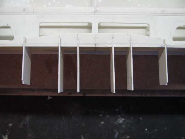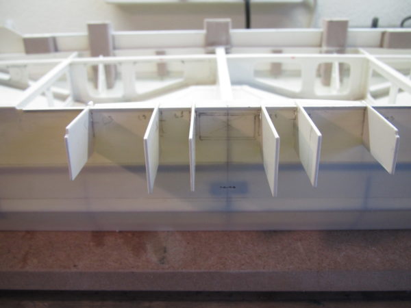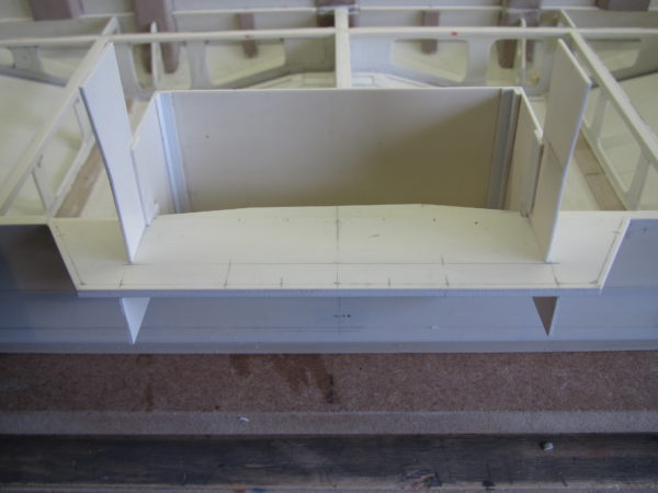 Het stuurhuis is voor een gedeelte geplaatst op het dek en een gedeelte buiten boord. Gestart met het gedeelte dat buiten boord staat. Van hieruit kun je dan verder bouwen. Er bevinden zich zes ruggen onder het dek. Die zijn rondom voorzien van verstevigingsribben. In het midden tussen de ribben is nog een rooster geplaatst. Verder bevinden zich de nodige deuren en luiken rondom in het gedeelte van het stuurhuis dat op het dek staat.