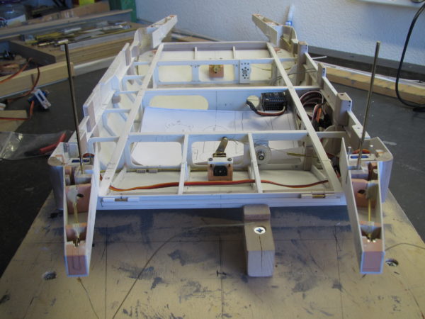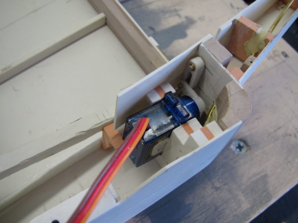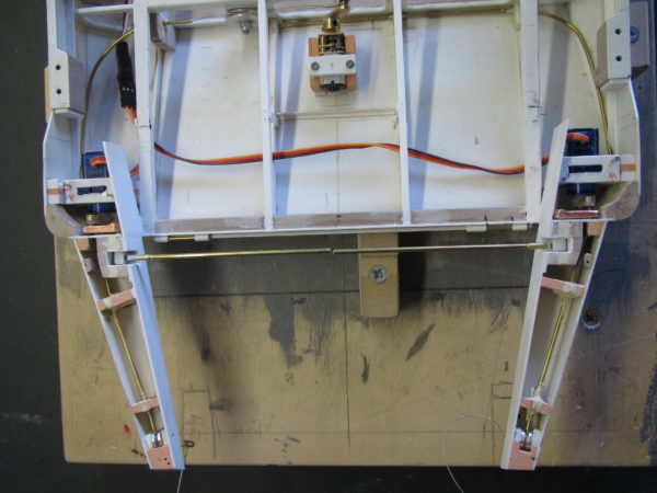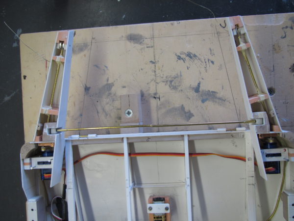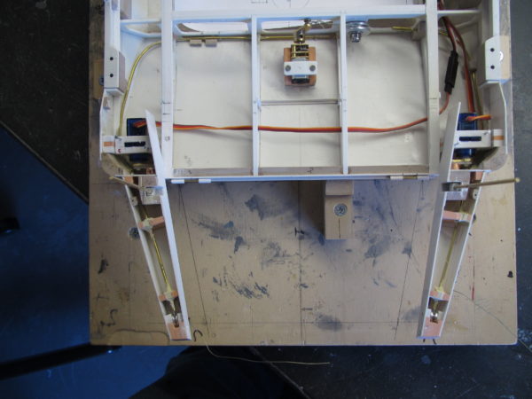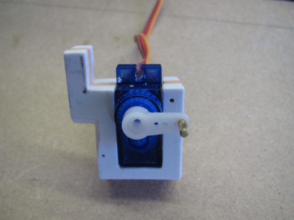 Het gelijktijdig open en dicht laten gaan van de slagbomen moet geen probleem zijn, was mijn gedachten. Met een aantal kleine tandwielen en een motortje zou het moeten lukken. Maar dat viel tegen. Ik had kunststof tandwielen gebruikt, licht in gewicht en een stuk goedkoper als metalen tandwielen. Maar ook onnauwkeuriger dan metalen tandwielen. Na veel wikken en wegen besloten het te proberen met servo’s. Heb een mini servo gebruikt. Daardoor bleef er ruimte over om een hefboom aan te brengen, waardoor het geheel een slag kon maken van 90 graden. Wel was het nodig per zijde een omkeerkabeltje tussen een servo te zetten. Daarmee draaien ze naar elkaar toe of van elkaar weg. Het geheel heeft al proef gedraaid maar moet bij montage verder ingeregeld worden.